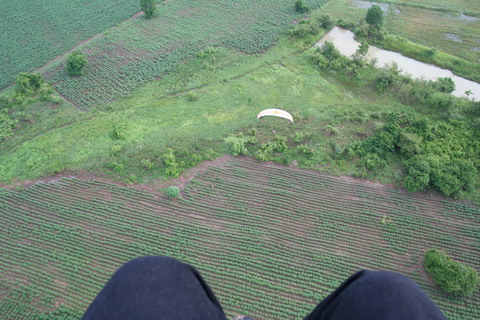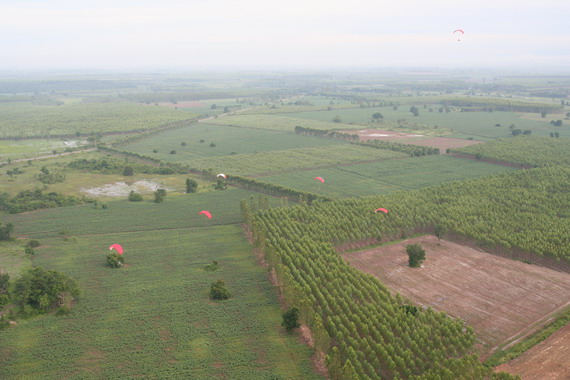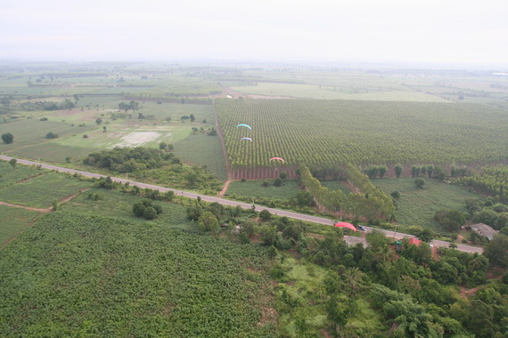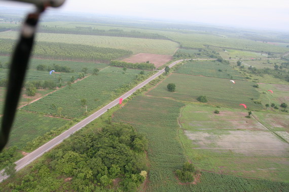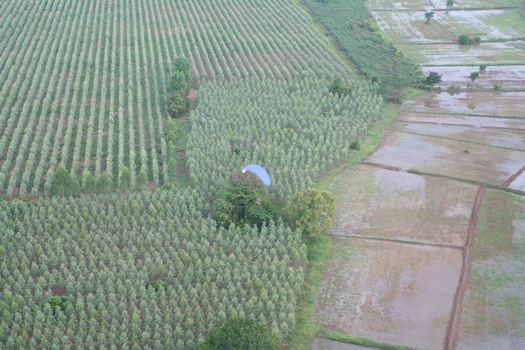 ร่ม 3 ตัวแรก ที่บินนำ บินอยู่เหนือป่ายูคาฯ ส่วนครูทุย เจ้าสำนักโสธรร่มบิน ร่มแดงทางซ้าย ใช้วิธี บินมุดต่ำหลบลม เลาะข้างป่ายูคาฯ จะได้ไปเร็วขึ้น