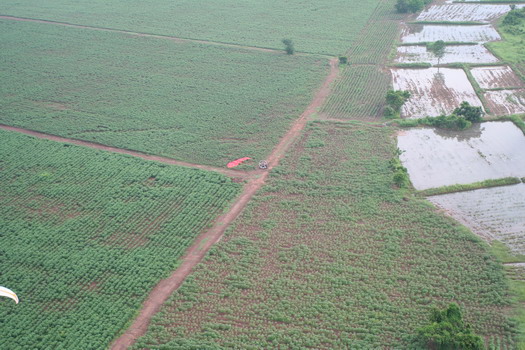 สามล้อพาราเพลนของครูกวีพัฒน์ เครื่องยนต์เกิดขัดข้อง... Force Landing ลงตรงช่องว่างระหว่างไร่มันสำปะหลัง...โชคดี ปลอดภัย ครับ