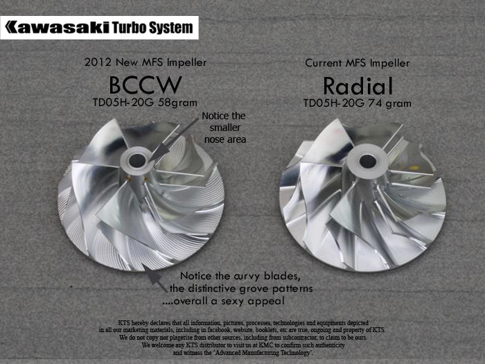 พัดใบมาจาก บ . kawasaki turbo system จากยุ่น ผลิตจากการนำมิเนียมก้อนมาทำการกัดขึ้นงานด้วยเครื่อง cnc ความหนาแน่นเยอะ ทนกว่า แล้วดีไซน์ให้เคลิบแกนเล็กลงเพื่อเพิ่มพื้นที่ใบพัดครับ ท่านึกไม่ออกดูจากรูปนี้แบบตัวอย่างแล้วกันคับ