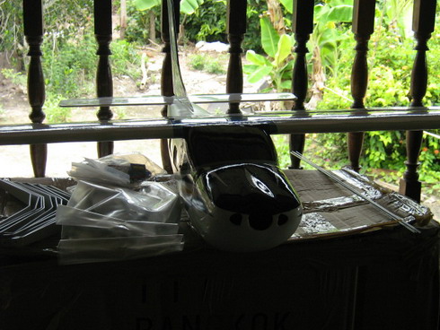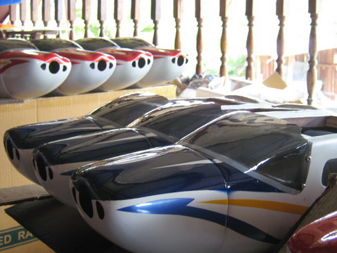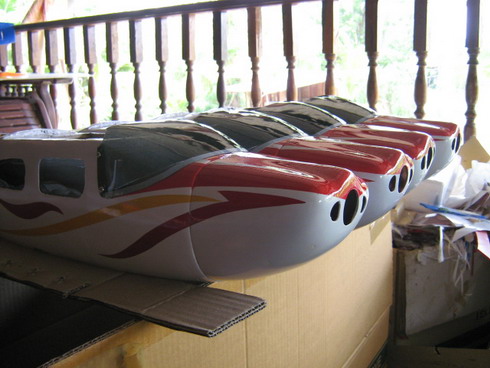 วัสดุที่ทำลำตัว มิได้ทำจากไฟเบอกลาส ครับผม ไฟเบอกลาส จะเปาะ กลิ่นแรงมาก อันตราย ราคาถูก วัสดุที่ผมได้นำมาผลิต จะเป็นคนละแบบกันครับผม จะเป็นจำพวกเรซิ่นประเภทหนึ่ง เราจะผสมสีลงไปในเนื้องานเลยก็ได้ หรือ ทำให้ใส แล้วทำสีด้านนอก ก็ได้ แห้งแล้วคนละสี กลิ่นไม่แรงมาก แข็งแรงกว่า
