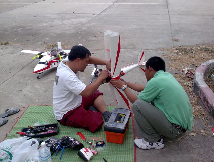 นี่ก็เป็นอีกกลุ่มที่มาขอข้อมูลการสร้างเครื่องบินกับพี่จ่าอ้วน....ก็นั่งสาธิตกันที่สนามนี่เลย....