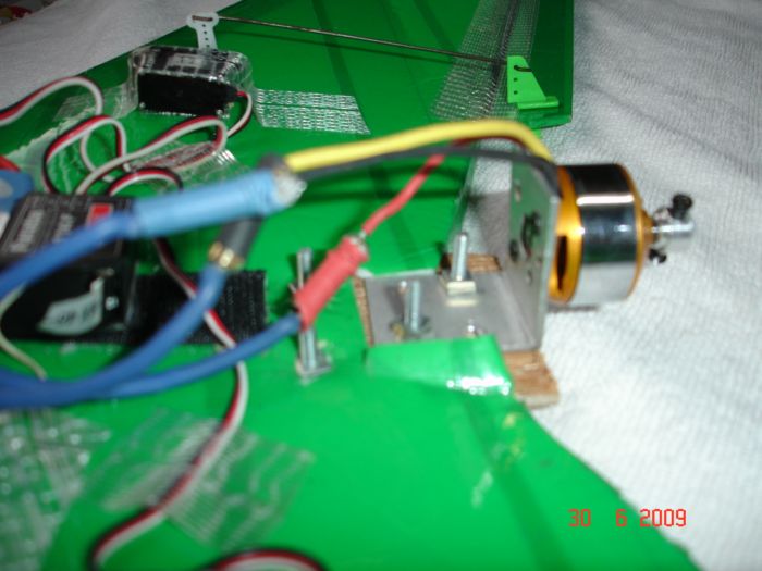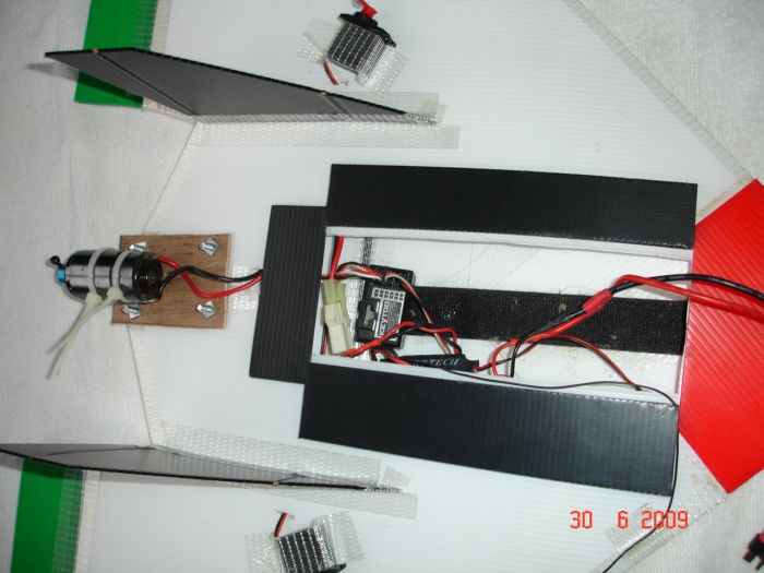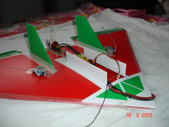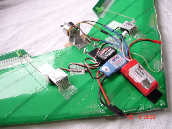 - จากรูปมอเตอร์ย้อยไปด้านหลังและวางแบตเข้ามาลึกด้านใน ประกอบกับปีกบินมีมุมแหลมมาก จุด CG จึงอยู่ด้านหน้า ( จากรูปแนวสปีดกับภาครับ ) ควรตัดส่วนท้ายของปีกบินที่จะชนใบเป็นแนวตรงเพื่อปรับมอเตอร์มาด้านหน้าให้มากที่สุด
