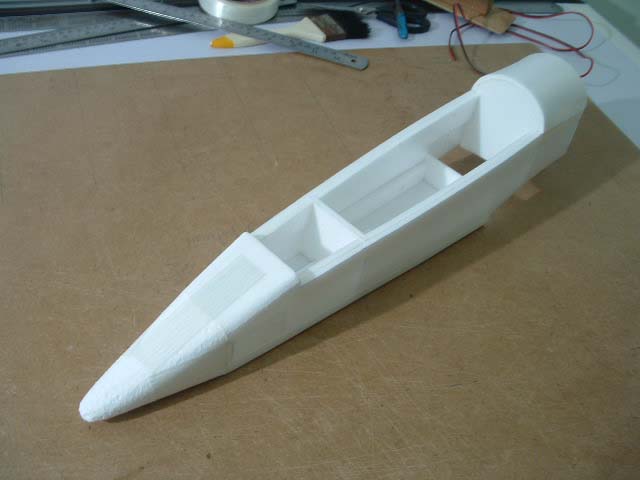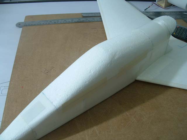ผมใช้โฟมแผ่น 5 มิลในการสร้างลำตัวและหาง ส่วนปีกนั้นตัดด้วยโฟมตัน เกรด AA ติดผิวด้วย OPP เทป