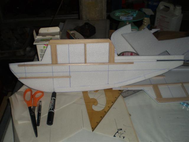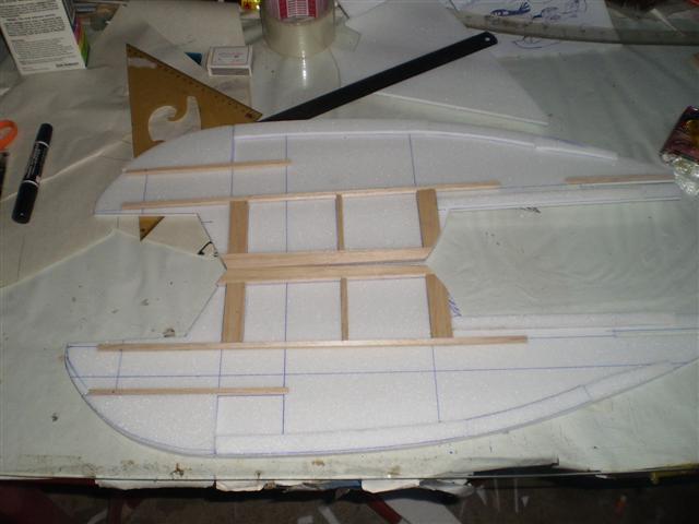 การเขียนแบบในลำนี้ไม่มีอะไรมากครับง่ายๆ......ลากเส้นลงโฟมไปเลยคือเส้น C L กับเส้นเปิดมุมปะทะและเส้นมุมมอเตอร์เท่านั้นครับ