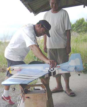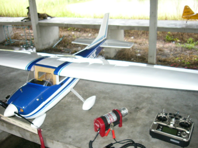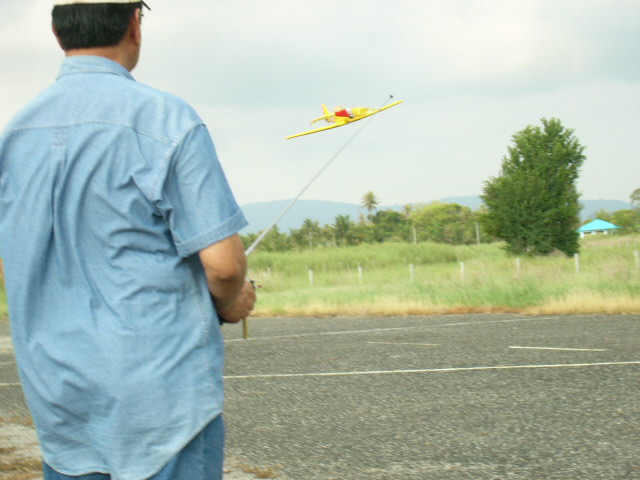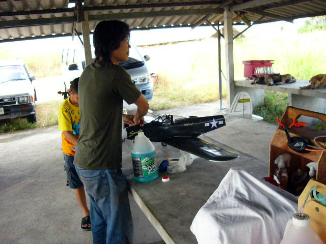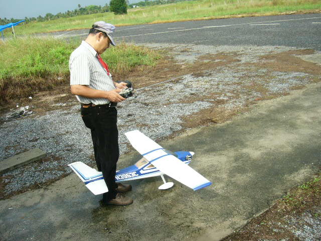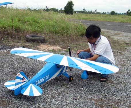 อาทิตย์ที่ 4 พ.ค.51 คุณไก่ เตรียมทดสอบผลงงานซึ่งพึ่งประกอบเสร็จเมื่อเช้านี้เอง กับ Piper J3 เครื่องยนตร์สี่จังหวะ ASP FS70AR