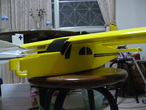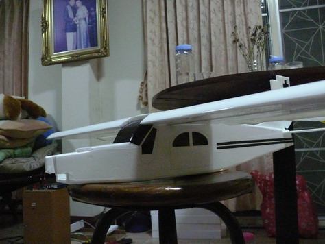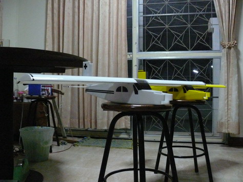 ... servo วางที่ปีก 2 ตัว เชื่อมต่อกันด้วยสาย Y ควบคุมปีกเล็กแก้เอียง ส่วนอีกสองตัว วางไว้กลางลำสำหรับควบคุมชุดพวงหาง