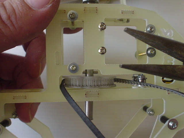 ร้อยพู่เลย์ และสายพาน แล้วใช้คีม คีป สลักใส่เข้าไปในรูเมนชาร์ป ตามรูป แล้วกดเมนชาร์ปลงโดยให้สลัก เข้าไปในร่อง ของ พู่เลย์ครับ