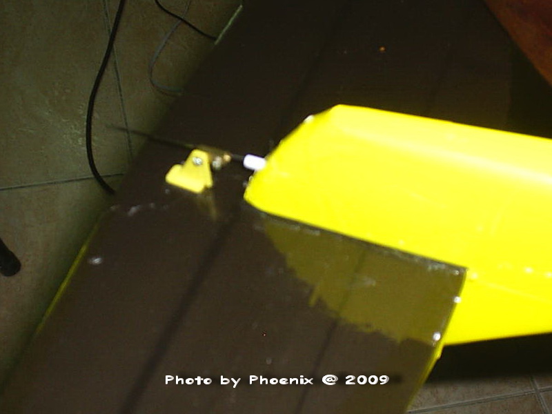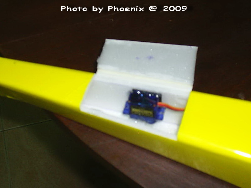 Servo ควบคุมปีกเล็กแก้เอียง ... ติดตั้งที่ปีกข้างละ 1 ตัว รวมเป็น 2 ตัว แล้ว Mix ให้มันทำงานร่วมกัน ... ผมชอบแบบนี้เพราะว่าหากตัวใดตัวหนึ่งเกิดเดี้ยงขี้เกียจทำงาน อย่างน้อยผมยังเหลืออีกตัวเอาไว้กัน ... แล้วก็ลงฉุกเฉินได้ ส่วนสายพ่วง Servo ... ทำมือ ... มันคือสาย Audio ของ CD-Rom ขอรับกระผม ... กำละ 20.-บาท