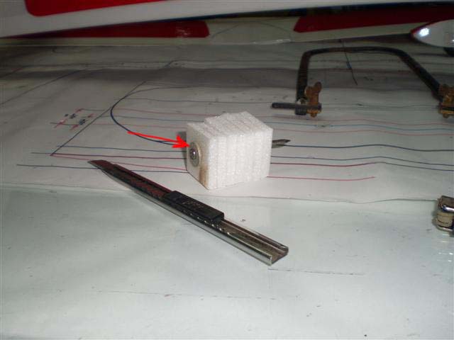 ตัดโฟมพอใกล้เคียงที่จะเอาลงตรงห้องเครื่องให้ได้ครับแล้วติดกาว จากนั้นเจาะรูด้วยตะปู 1 1/2 นิ้วให้ทลุ