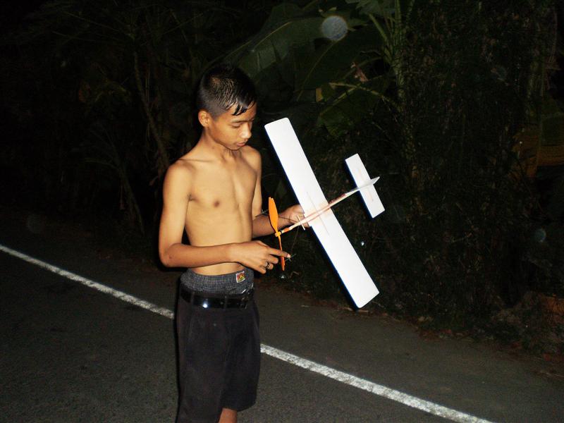 ผมไม่รู้ว่าจะเอายางอะไรมาแทนได้ก็เลยเล่นยางวงเล็กไปก่อนครับ และก็ได้นักบินทดสอบมาด้วยวันนี้ส่วนผมเป็นคนถ่ายภาพครับ การเล่นเครื่องบินประเภทนี้ต้องใช้ความพยายามหน่อยในเรื่องปั่นใบพัดเพื่อไขลานครับ