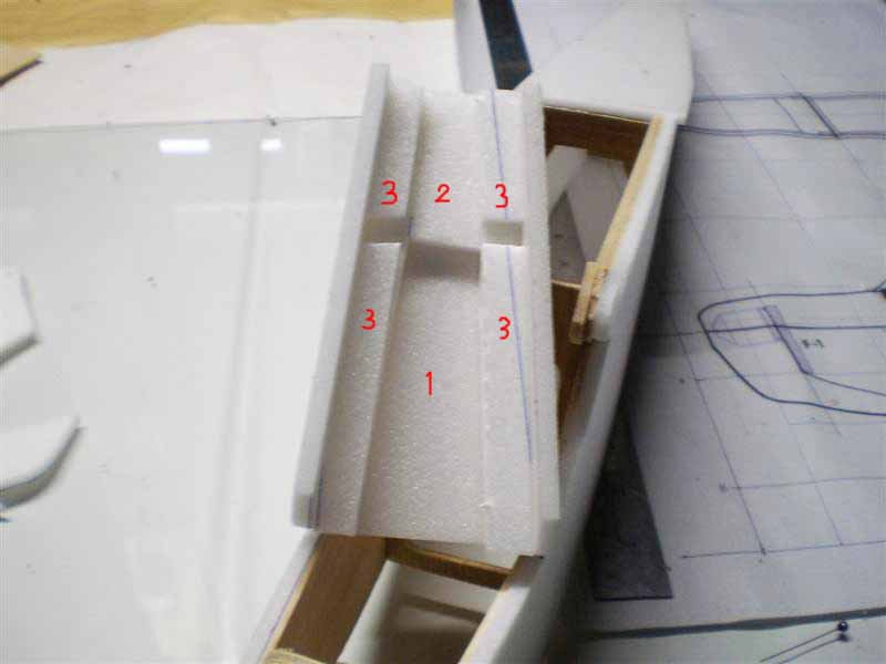 พอกาวแห้งแล้วก็จับหงายขึ้นมา ผมเขียนเลขกำกับไว้ แผ่นบนสุดเลข 1 ครับแล้วตัดโฟมกว้างซัก 1 ซ.ม.ยาวให้ตลอดเลยหัวท้าย(เลข 3 )แปะติดลงไป 2 ชั้น ส่วนหน้าสุด (ตรงกับมอเตอร์)ผมเอาโฟมตัดพอดีๆยัดลงไป(เลข 3 )
