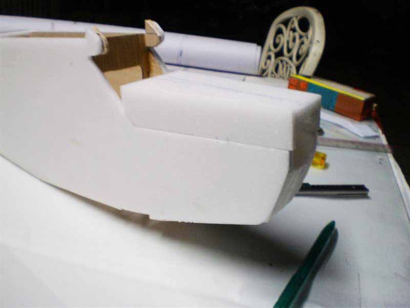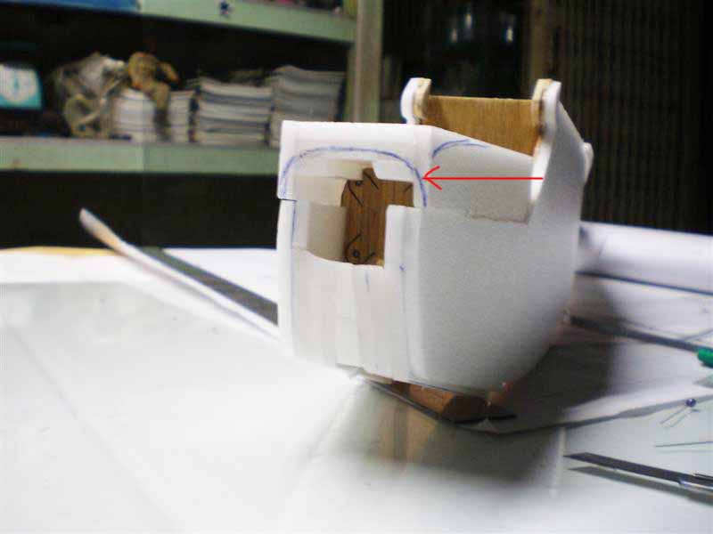 มาเริ่มกันครับ......ผมใช้โฟมตัดให้ได้ขนาดตามแบบที่เหลือตรงส่วนบนนะครับ 2 ชิ้นด้วยกันเอาไปวางไว้ตรงตำแหน่งที่มันจะอยู่แล้ววัดความกว้างหัวท้ายความยาวด้วยเอามาลงโฟมแล้วตัดประกอบกับแผ่นด้านข้างเลย...