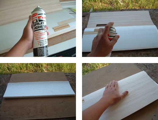 แล้วก็นำไปพ่นกาว ทั้งแผ่นเลย พ่นซัก 2 รอบ แล้วทิ้งไว้ 1 นาที จึงค่อยเอามาติดเข้าด้วยกัน (อย่างระมัดระวัง เพราะว่ากาวแน่นมากถ้าพลาดแก้ยาก) ใช้โฟมที่ตัดออกจากปีกในครั้งแรกๆ มารองเพื่อให้ปีกอีกด้านไม่เป็นรอย แล้วใช้มือรีดกดไปทั่วๆปีก เมื่อติดแน่นดีแล้ว ใช้กาว CA หยอดซ้ำที่แนวชายหน้าและชายหลังปีก