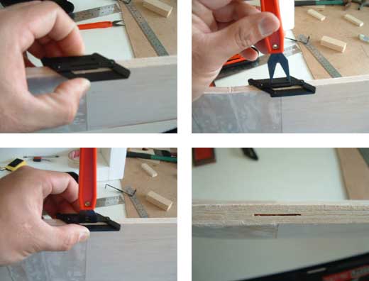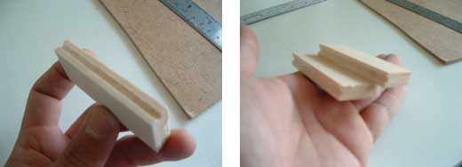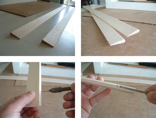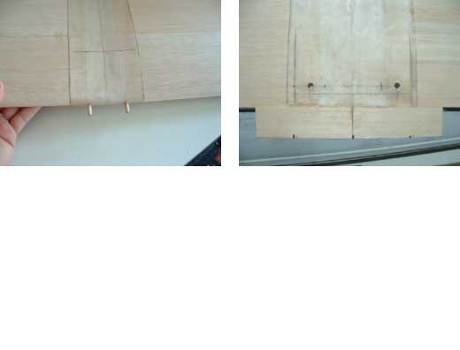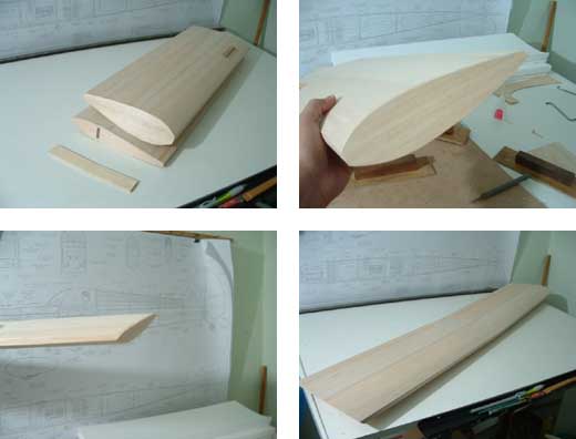 แล้วก็นำมาบากร่อง ด้วยคัทเตอร์ หรือจะใช้กระดาษทรายม้วนกะตะเกียบฝนให้เป็นร่องดังภาพก็ได้ แล้วก็แปะเข้าด้วยกันด้วยกาว CA เมื่อทำทั้ง 2 ข้างเสร็จแล้วก็ขัดไม้ส่วนที่เกินทั้งด้านบนและล่างให้เข้ารูปเข้าทรงกับแอร์ฟรอยด์ของปีก