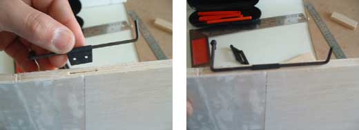วัดระยะจากAileron Arm แล้วเจาะเข้าตรงสันไม้ ด้วยสว่านขนาดเล็ก แล้วใช้ท่อ คมๆเล็กๆ ทำร่องเข้าไปหาจุดที่เจาะ