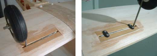 นำไม้อัดมาเสริมเข้าไปที่ท้ายเครื่องด้านล่างตรงโคนหาง ยึดด้วยกาว แล้วขัดแต่งให้เรียบ ส่วนของลวดล้อหลังนั้นผมใช้ ซี่จักรยานแบบแสตนเลสมาดัด ก็ไม่ยากครับ ดัดเสียไป 3 อันกว่าจะพอใจ เสร็จแล้วก็ติดตั้งเข้ากับลำตัวโดยการไขยึดด้วยสกรูเกลียวปล่อย เสร็จแล้วก็แกะออกแล้วหยอดกาว CA ลงไปในรูเกลียวที่เราไขมันเมื่อตะกี๊ เป็นการสร้างความแข็งแรงให้กับเกลียวได้ครับ