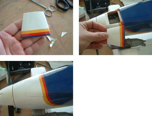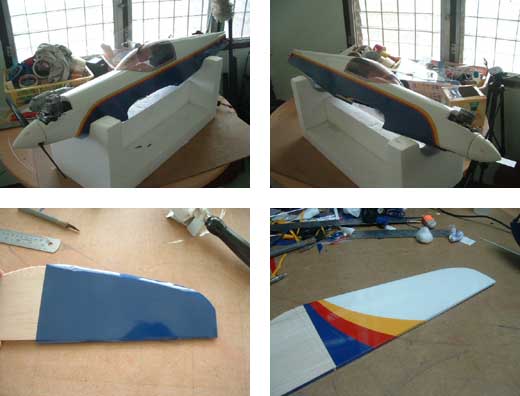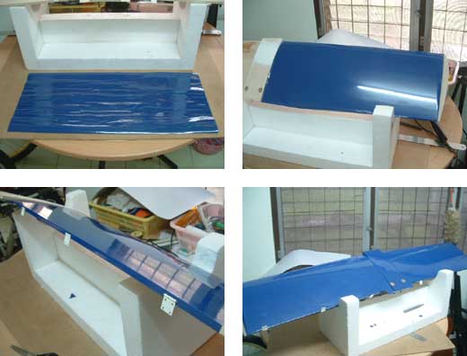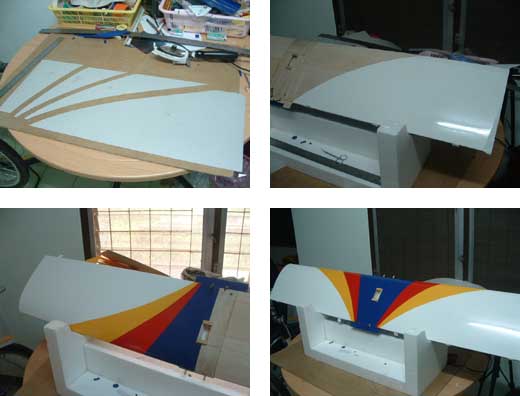ส่วนการรีดปีกที่ด้านบนนั้น ก่อนอื่นก็ต้องทำแพทเทิร์นของลายที่เราจะทำการรีดก่อนครับ ใช้กระดาษแข็งมาวาดตามแบบที่ต้องการตกแต่งลาย แล้วตัดแบ่งออกเป็นส่วนๆ เมื่อจะรีดฟิมล์ ก็ให้รีดชิ้นปลายสุดก่อน แล้วรีดชิ้นต่อไปถัดเข้ามา ให้ชายขอบของฟิมล์เกยทับกัน ซัก 5 มิลลิเมตร เสร็จแล้วจึงรีดปิดที่ปลายปีก ส่วน aileron ก็รีดด้านล่าง ก่อน แล้วรีดด้านบนลงมาเกยขอบ