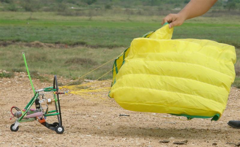 อันที่จริงการเล่นร่มบิน มันน่าจะมีความไม่สะดวกอยู่ก็ตรงนี้จุดหนึ่งครับ คือการขึ้น ซึ่งถ้าร่มไม่เปิด หรือร่มพับไม่กินลม...ร่มก็จะไม่ขึ้นแน่นอน อีกอย่างหนึ่ง...ขณะที่วิ่งเเท็คออฟไปบนพื้น พอร่มกางออกจะเกิดแรงยกทันที..การเกิดแรงยกทันทีแบบนี้ ถ้าเราเร่งแรงเกินไป ร่มจะกระตุกโครงร่ม แทนที่จะขึ้นฟ้าแบบเครื่องบิน กลับกระตุกคว่ำทันทีครับ.....พอคว่ำก็กลิ้ง พอกลิ้งก็ม้วน..