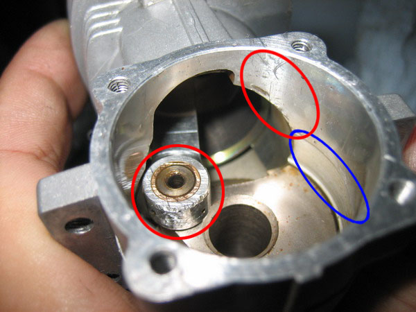 แล้วบริเวณที่วงสีน้ำเงินไว้น่ะ น่าจะเป็นรอยเสียดสีของก้านสูบแน่ๆ เลย อย่างนี้ไม่มีปัญหาอะไรหรอครับ จำเป็นต้องเปลี่ยนไหมครับ