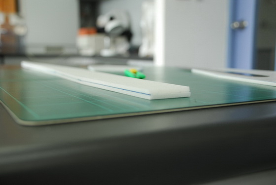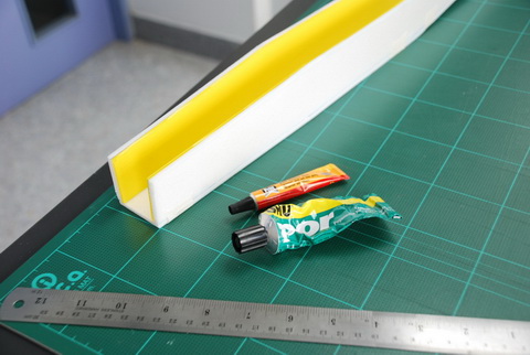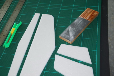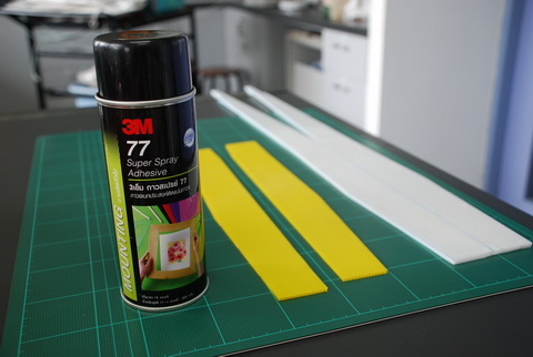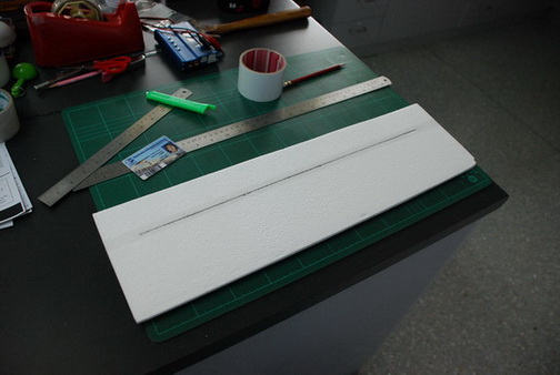ลำนี้ผมใช้โฟม 0.5 ปอน์ด จากร้านเครื่องเขียนใกล้บ้านเบาดี แต่อ่อน ปีกรัดยางนาน ๆ อาจกินเนื้อโฟมได้ ดังนั้นจึงใช้เศษบัตรพลาสติกติดเอาไว้เพิ่มความทนทานอีกนิดครับผม