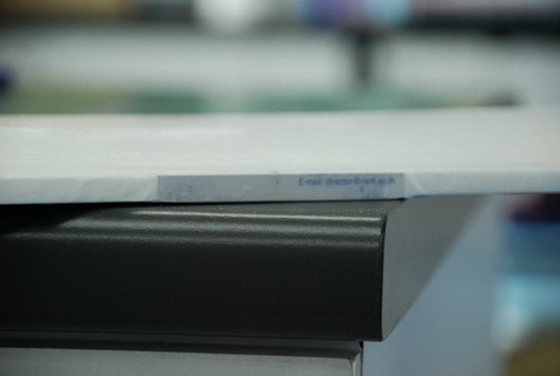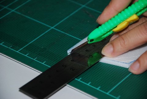 ทำบานพับต่อ ... วางไม้บรรทัดและใช้ cutter ตัดเฉียง 45 องศา (ยืมมือเลขาฯ มาใช้ ... ให้เห็นใบหน้าไม่ได้เด๋วโดน... อิอิ)