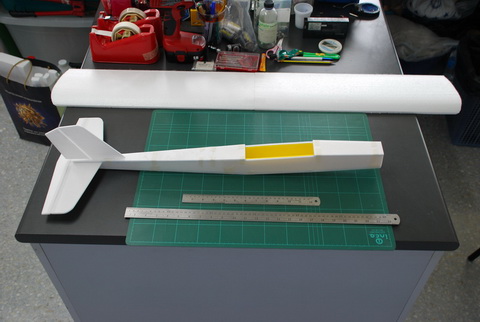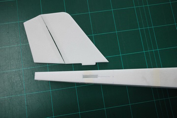 จากนั้นก็แปะลำตัวด้านบนแล้วก็เจาะทำเดือยยึดแพนหางดิ่ง ...