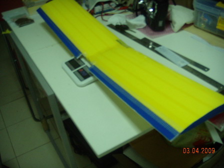 ปีกอันที่สองครับ หาเทป OPP ได้สีเหลืองกับน้ำเงิน เลยออกมาตามรูป รอทำลายอีกหน่อย (ยังคิดไม่ออก)