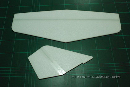 สำหรับแพนหางดิ่งและแพนหางระดับ ผมใช้โฟมอัดขนาด 5 มม. กะ ๆ วาด ๆ ขีดเขียน แล้วก็ตัดออกมาแบบนี้ครับ