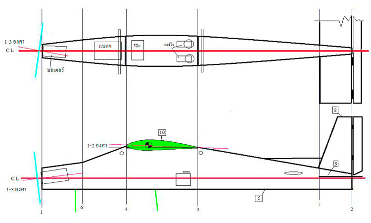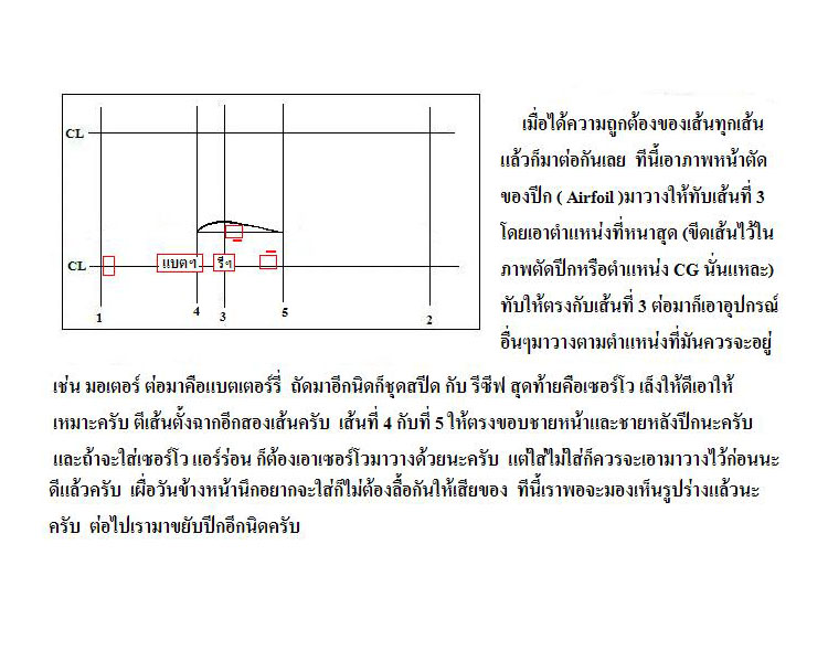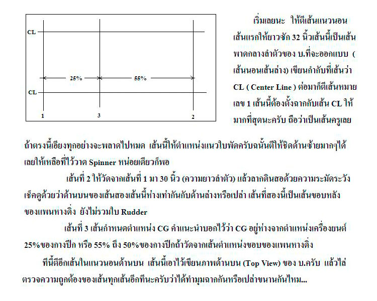 เพื่อนๆครับรู้สึกว่าผมจะพลาดไปอย่างหนึ่งแล้ว ความยาวลำตัวที่วัดจากเส้นที่ 2 ไปถึงจุด CG ขอแก้เป็น 50% นะครับเพราะถ้ารวมกับตำแหน่งเครื่องยนต์ถึง CG อีก 25% ก็จะรวมกันได้ 75% ตามที่กำหนดไว้ทีแรกนะครับ