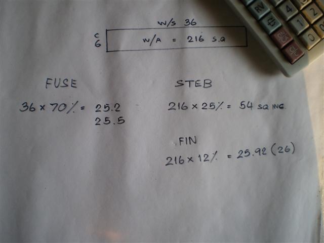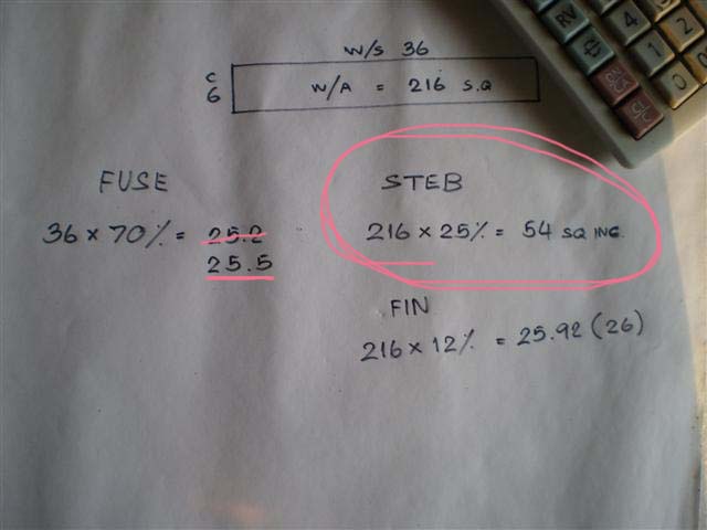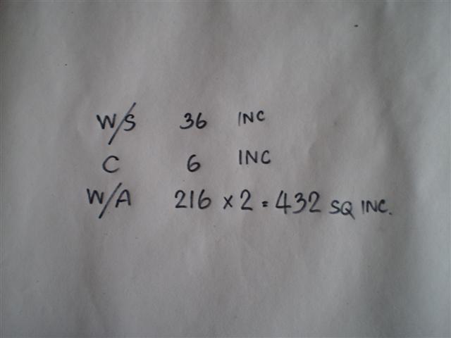 ทีนี้ก็เอา 6 คูณ 36 เท่ากับ 216 ค่าเป็น ตารางนิ้วนั่นก็คือ พ.ท.ปีกของหนึ่งปีก เอา 2 คูณก็ได้ 432 ต.ร.นิ้ว ไม่รู้ว่าจะมากไปรึเปล่า เพื่อนๆทำให้เล็กกว่าผมหน่อยก็จะดีนะครับ หรือถ้ามีมอเตอร์ทีแรงกว่านี้ก็ไม่เป็นไรเพื่อถ้าบินอืด