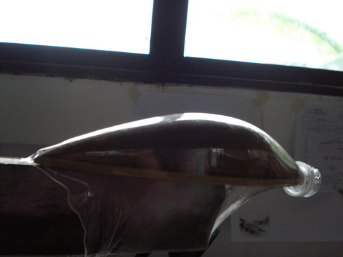 ถึงตาของ canopyกันแล้วครับ หาไม้เนื้อแข็งมาขัดให้ได้รูปทรงของเครื่องบินเรา จะนั้นนำขวดน้ำอัดลมฝ่าก้นออกแล้วเสียบเข้าไปในโมของเราอัดให้แน่น แล้วนำไปอุ่นบนเตาแก๊สครับค่อยๆครับส่วนนี้ ใกล้เกินอาจไหม้ได้ครับ