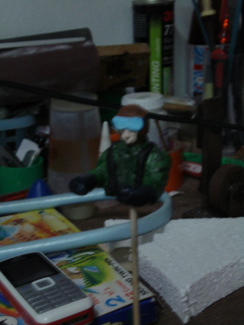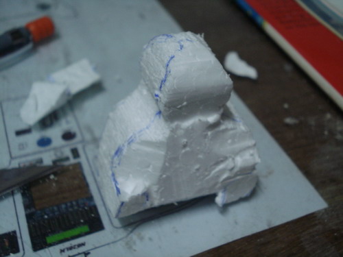 งานต่อไปก็เป็น ของแถมครับงานนี้นักบินสำหรับเครื่องบินของเราเอง โฟม1นิ้วเขียนรูปร่างคราวๆลงไป แกะไปๆมาให้มีหมวก มีเสื้อมีแว่นตาก็พอครับ แขนค่อยทำแยกแล้วเอามาต่ออีกทีครับ