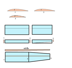 ท่อนแรก(ด้านในปีก)เอาแบบ 1 กับ 2 ไปประกบแล้วตัดเหมือนกับตัดปีกทั่วๆไป ท่อนที่สองคือท่อนปลายปีกก็ให้ถอดเอาแบบแอร์ฟอยที่ 1 หรือ 2 มาทาบด้านในของท่อนโฟมแล้วเอาแบบที่ 3 ทาบไว้ที่อีกฝั่งของท่อนโฟมซึ่งก็คือปลายปีกนั่นเอง แต่คราวนี้ก็ต้องติดแบบแอร์ฟอยขึ้นสูงกว่านะครับ (ดูภาพที่ผมเขียนคงเข้าใจ) แล้วก็ตัดได้เลยครับ เสร็จแล้วก็เอาปีกสองท่อนมาชนกันด้วยการทากาวแล้วเอาไม้สปายัดลงไปก็เสร็จแล้วครับ..