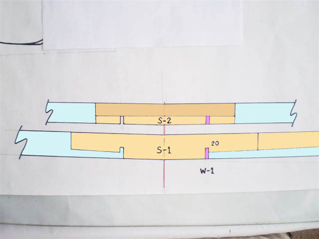 ผมให้ที่ 3 องศานะครับ มาดูที่ S-1 ก่อนมันจะซ้อนกันระหว่างสปาปีกกับตัว S-1 ครับ แถบซีกขวาของปีกจะเห็นไม้สปายาวออกไป ส่วนซีกซ้ายจะเห็นแค่แผ่นไม้อัด 3 ม.ม.ที่เป็นตัวดามไม้สปานะครับ