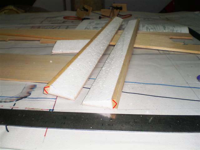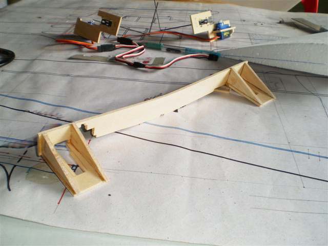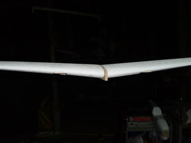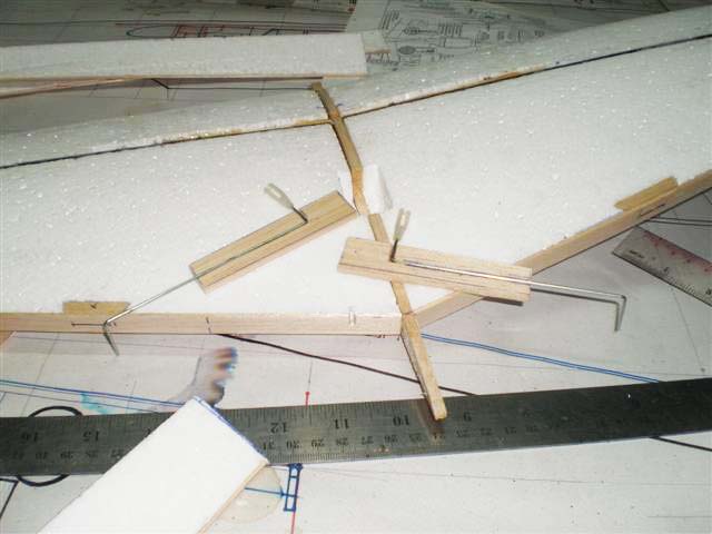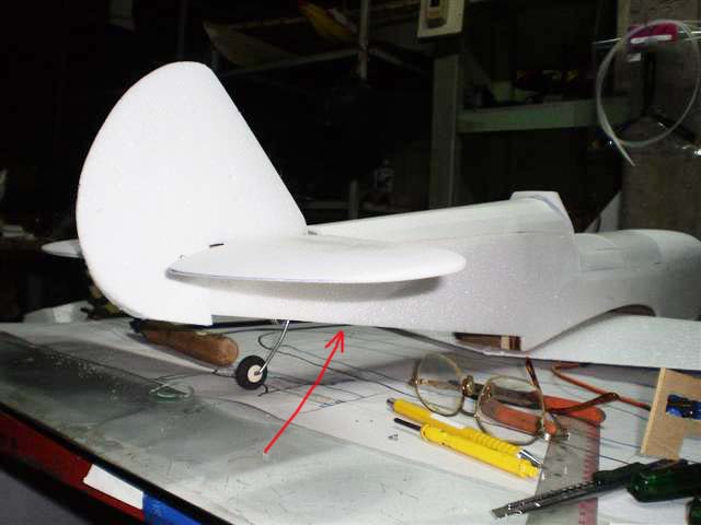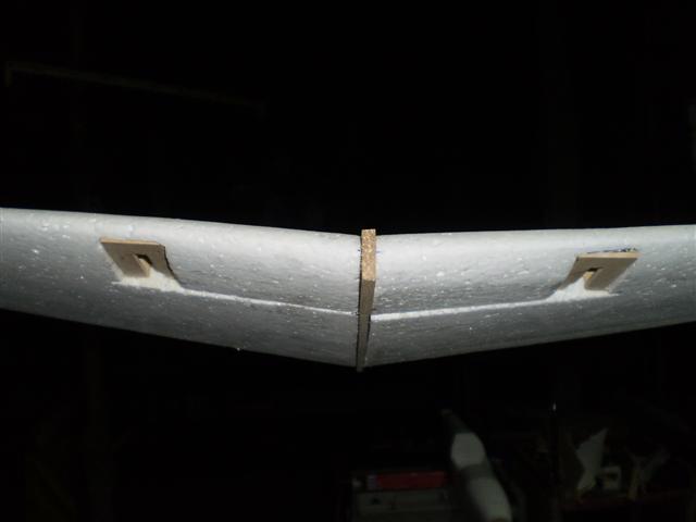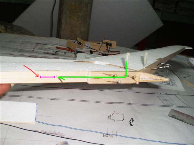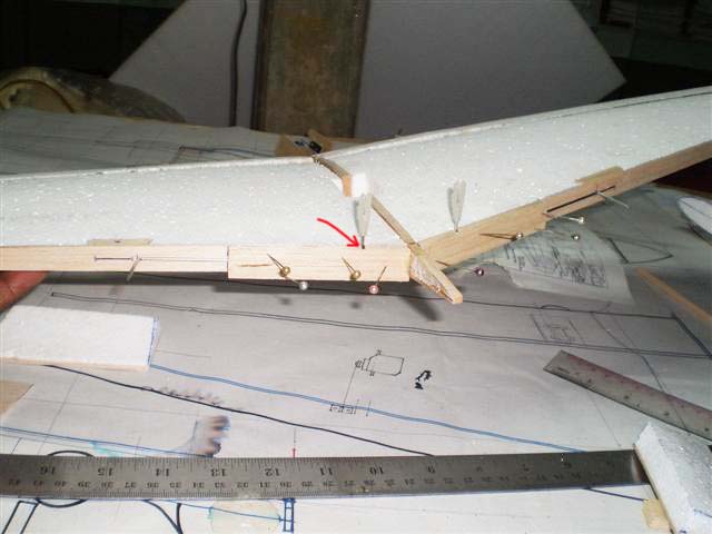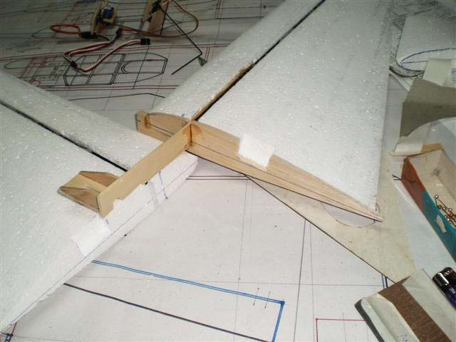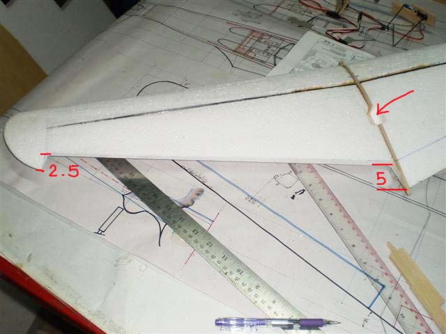 ส่วนที่ตัดออกมาจากปีกก็คือแผ่นแอร์ร่อนนั่นเอง ผมเอาไม้ 2 ม.ม.รองไว้ใต้โฟมครับ แล้วกรีดโฟมตรงส่วนหน้าออก 5 ม.ม.เพื่อต้องการใส่ไม้หนา 5 ม.ม.ลงไปครับ ไม้ตรงนี้ผมต้องทำให้เป็นสามเหลี่ยมแล้วยัดบานพับทีหลังยังไงครับ