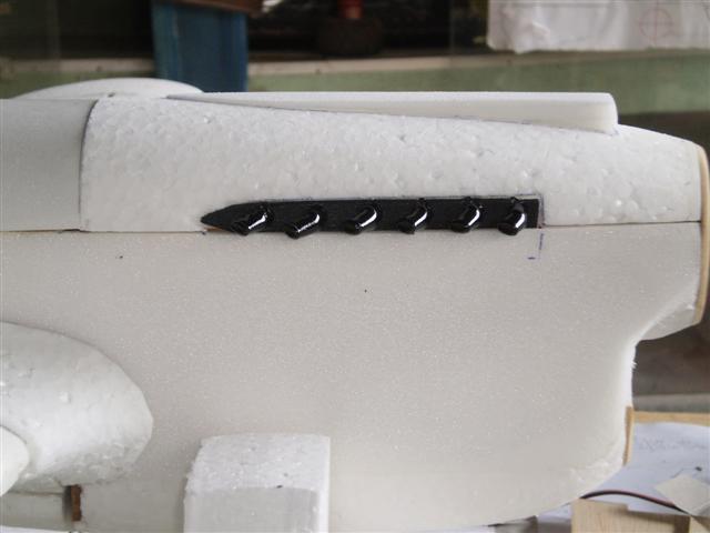 เอาเศษไม้หนา 3 ม.ม.ก็เกินพอแล้ว มาฉลุรูกลมๆให้พอดีกับหลอดที่เรางอไว้ทำท่อ 6 อันก็ 6 รูครับแล้วลองเสียบเรียงดูครับ ก่อนจะไปเซาะร่องที่ฝาครอบเครื่องยนต์