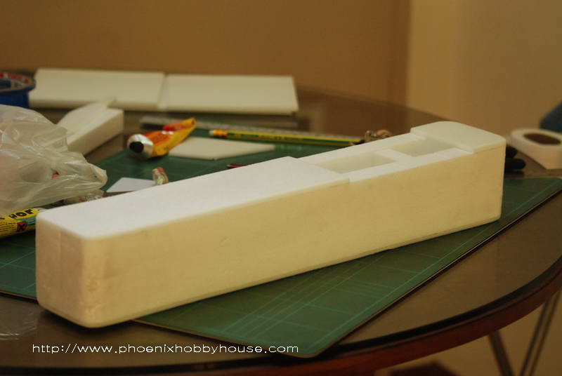 จากนั้นก็ปิดลำตัวด้วยโฟมอัด 5 มม. ขัดลบมุมให้เรียบร้อย