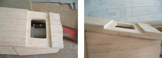 เมื่อปาดและขัดเรียบแล้ว ก็เอาบัลซ่าบล็อกหนา 10 มิล ยาวเท่าส่วนท่อนหัวเครื่อง มาแปะเข้าไป จากนั้น ค่อยๆเหลาด้วยคัทเตอร์ ออกคร่าวๆก่อนเป็นการลดขนาด