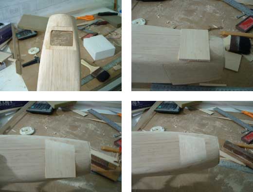 การเหลาช่องเสียบชุดหางตรงนี้ ใช้ไม้ บัลซ่า หนา 10 - 12 มิล มาแปะเสริมเข้าไปที่ส่วนปลายสุดของหาง โดยผมใช้สแตร็ป และฟิน ทดลองติดตั้ง ให้ได้ฉาก ทั้ง 2 แนว และต้องกึ่งกลางด้วย เช็คให้แน่ใจแล้ว ยึดกาว CA จุดเล็กๆแค่พออยู่เท่านั้น จากนั้นจึงนำไม้บล็อกเข้าประกบซ้ายและขวา เล็งจากเส้นหลังเครื่องให้เอียงเท่ากัน แล้วรื้อเฉพาะฟินกับสแตร็ปออกไปก่อน ใช้คัทเตอร์ค่อยเหลาแบบหยาบๆก่อน เมื่อขนาดลดลงแล้ว จึงขัดด้วยกระดาษทรายบล็อกจนเรียบเท่ากัน