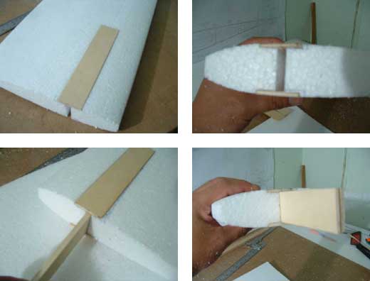 แล้วก็มาวัดทำเครื่องหมายบนตัวปีก เดี๋ยวเราก็จะกัดร่องลงไปบนโฟม เท่ากับไม้ยึดขาล้อที่ทำเอาไว้ แล้วก็ทดลองใส่เข้าไปดูก่อน เมื่อได้ที่แล้วก็จับมาทากาวแล้วใส่ลงไปจริงๆ