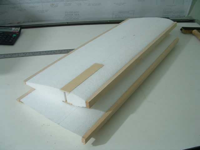 นำไม้บัลซ่าขนาด ขนาด 10 มิล * 13 มิล ยาวเท่าความยาวปีก 2 อัน เอามาทำชายหน้าและขนาด 10 มิล * 8 มิล 2 อัน เอามาทำชายหลัง ที่เราตัดเตรียมเอาไว้เมื่อคราวนู้น มาติดกาวเข้าไปกะปีกครับ ทั้งชายหน้าและชายหลัง เสร็จแล้วตัดส่วนที่เกินออก แล้วขัดมุมชายหน้าให้เข้ารูปกับรูปแบบของแอร์ฟรอยด์ของปีกครับ