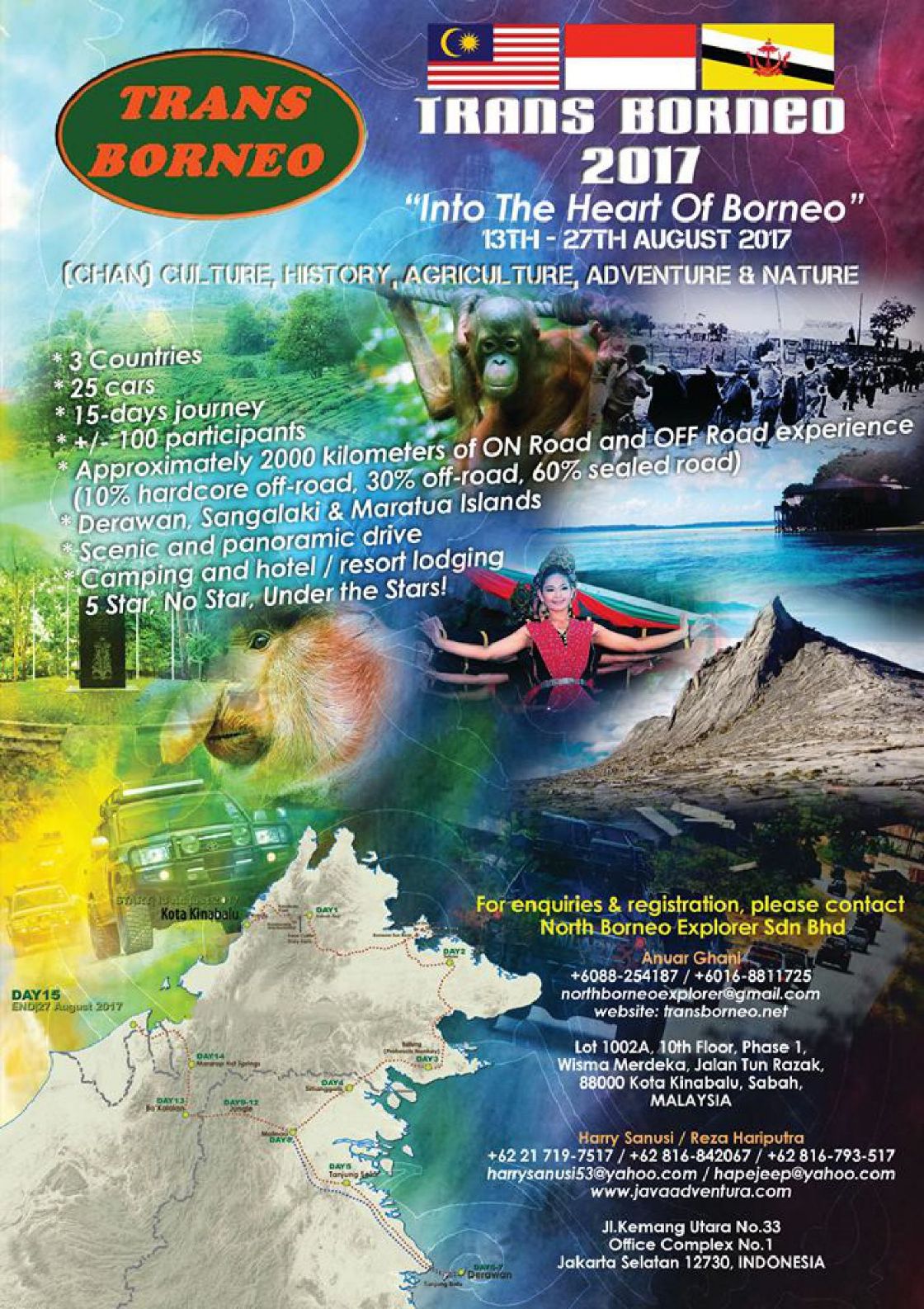 อานัว กานี สุดยอดมืออาชีพนักจัดทัวร์ท่องเที่ยวออฟโรดผจญภัยตามป่าเขาดงดิบรอบเกาะบอร์เนียวมายาวนาน ตั้งแต่ปีค.ศ.1996 หรือ 21 ปีที่ผ่านมาแล้ว ซึ่งเคยผ่านการจัดนำเที่ยวแบบนี้มามากกว่า 30 ครั้งแล้ว ปีนี้กลับมาจัดท่องเที่ยวป่าอีกครั้ง ทุ่มตัวจัดอย่างเต็มที่ตามแบบรายการดั้งเดิม ทรานบอร์เนียว 2017 เข้าถึงใจกลางป่าดงดิบบนเกาะบอร์เนียว ที่เคยมีการท่องเที่ยวผจญภัยรายการคาเมลโทรฟี่ถึงสองครั้ง จนกลายเป็นการเริ่มตำนานท่องเที่ยวออฟโรดในประเทศมาเลเซีย อินโดนีเซียและอีกหลายประเทศในแถบนี้ ครั้งนี้การเดินทางจะผ่านป่าดงดิบและภูเขาสูง วิวทิวทัศน์ธรรมชาติสวยงาม ในสามประเทศ เนการาบรูไน , มาเลเซีย และอินโดนีเซีย ผู้ที่ชื่นชอบการเดินทางแบบท่องเที่ยวออฟโรดผจญภัยแบบไม่มีการแข่งขัน น่าจะเข้ามาสัมผัสการท่องเที่ยวออฟโรดผจญภัยระดับตำนาน ส่วนใหญ่ต้องแคมป์ปิ้งในป่าดงดิบธรรมชาติ ค่าใช้จ่ายราคาเข้าร่วมเดินทางคนละ 750 ดอลล่าร์สหรัฐ( 25,500 บาท) หรือเช่ารถยนต์คันละ 3,000 ดอลล่าร์สหรัฐ( 102,000 บาท) ไปได้ 3 คน + 1 คนขับรถ ติดต่ออานัว กานีที่: whatsapp to Anuar at +6016-8811725 , e-mail: anuarghani123@yahoo.com and anuarghani311@gmail.com
