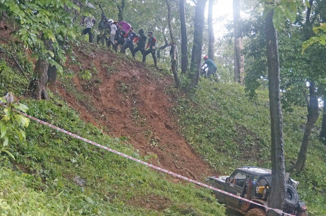 สนามแข่งขันสมรภูมิออฟโรดแห่งแรกกลางสายฝนตกกระหน่ำ SS1 ขึ้นลงผาดินชันสูงยาวลื่นเละอันตรายที่แคมป์ไซค์สวนป่าดีโอที หมู่บ้านคำบาหะรี, ทาลูกา ซันเกียม