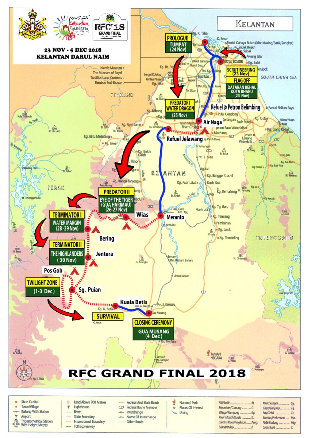 การแข่งขันรอบสุดท้าย RFC Grand Final 2018 เมื่อวันที่ 22 พฤศจิกายน ได้รับการเปิดตัวอย่างเป็นทางการที่โรงแรมไอบิสเคแอลซีซ๊(Ibis KLCC) ได้รับเกียรติทำพิธีเปิดโดยรัฐมนตรีว่าการกระทรวงการต่างประเทศสหพันธ์สาธารณรัฐเยอรมนี และในวันที่ 24 พ.ย. มีรถยนต์ผู้เข้าร่วมเดินทาง 150 คัน จากเมืองโกตาบาห์รู(Kota Bahru) ไปจนถึงเมืองตุมปาด(Tumpat) และต่อมาก็เข้าสู่เมืองทานาห์ เมราห์( Tanah Merah), กัวลาไกร(Kuala Krai) และเข้าสู่ ป่าลึกที่สุดของภาคใต้กลันตัน และสิ้นสุดการแข่งขันที่กัวมูซัง(Gua Musang) ในวันที่ 4 ธ.ค. รวมเป็น 12 วัน (แทนที่จะใช้เวลา 10 วันตามปกติของ RFC) เนื่องจากเดินทางไกลมากบนเส้นทางออฟโรดก่อนจะถึงเมืองหรือหมู่บ้าน รถยนต์แข่งและรถยนต์ที่เข้าร่วมการแข่งขันทั้งหมด ต้องผจญภัยเร้าใจในเส้นทางออฟโรดพิเศษ จึงต้องมีน้ำมันสำรองใว้ให้ได้มากเพียงพอ ตั้งแต่วันที่สามไปจนถึงสิ้นสุดการแข่งขัน