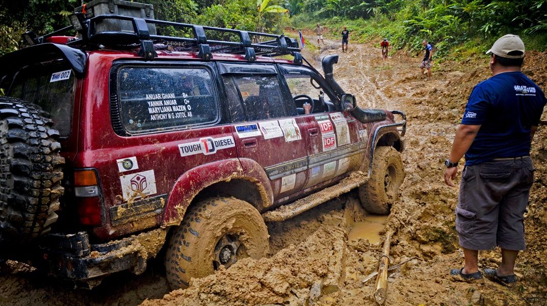 Day 6, December 2nd, The weather was very cold last night. The first group of convoy woke up early in the morning and began to climb up Mount Slukut the highest peak of Borneo in Kalimantan Indonesia at a height of 1,558 meters above sea level about halfway between Benuang Village Semamu distance 65 km. The first group of Convoy 10 cars started from the eighth kilometer moving approximately 500 meters found obstracle a large tree hundreds of years old falling block the road, using about an hour to cut and clear the tree. After that it were a long way tough, steep and dangerous mountains full of holes,channel, big and small rocks, Everyone were tiredness from walking up and down the high mountains for winching cars and had to using very long rope in many places. The steep and hard-core path seems like none stop. There were no big tree for winching , had to using ground anchor in difficult with a soft ground that pervades from rain which made the ground wet and slippery from liquid soil on the top. The toughest obstracles had more than 5-6 places. Man and machine had to fighting with hardcore heart and reach the summit of mountain Slukut at almost midnight and try to continue moving forward down from the peak of mountain but the way down from the mountain were still very dangerous in the darkness, therefore convoy group one had to stay overnight near the summit of Mount Slukut among the strong cold wind blowing and surrounding with the white mist.