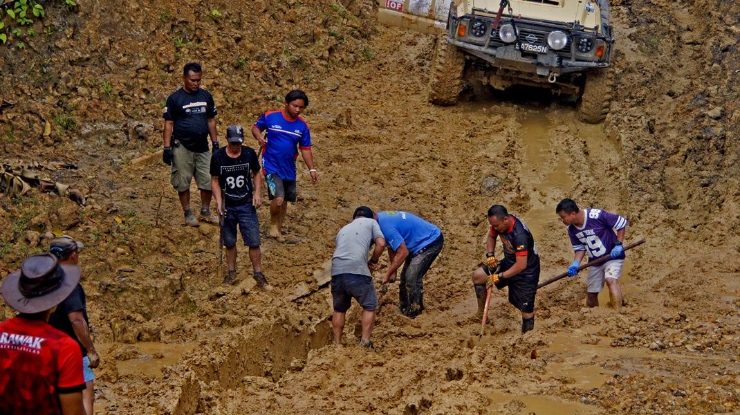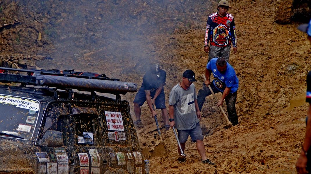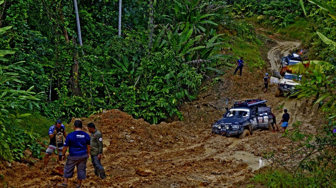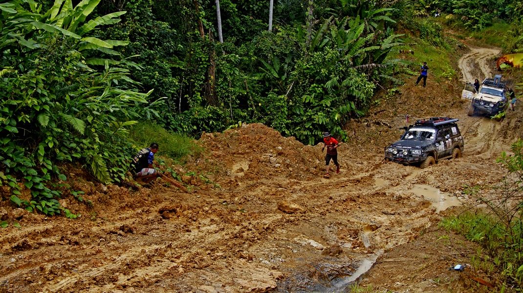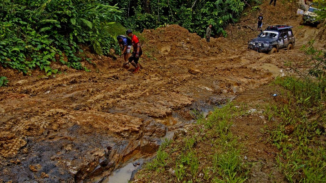 Day 7, December 3rd, the first group of 10 cars started to travel up the steep slope just under a hundred meters found the long hardcore obstracles with a line of stone like bridges full of many rutted waiting and the side were a deep abyss. And turning up to a rocky hill with many danger trenches to destroying the car's suspension along the hill road. The last hundred meters were a road that creates a large long rutting which tough and brutally, on this obstracle had to using winch by ground anchor and a large tree stump helps to winching. All 10 cars of first group spent 7 hours for passing the last hardcore obstracles. But while traveling down hill to the village of Semamu an accident occurred when a car overturned on a steep curving turn, lucky no one were hurt and arrived at Semamu village on 10 p.m.