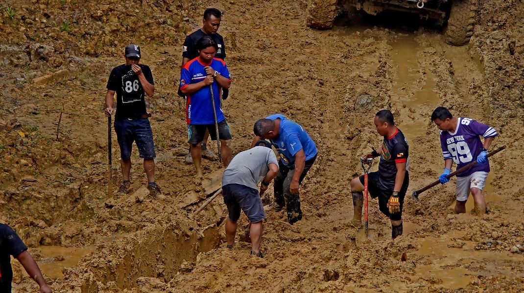 Day 6, December 2nd, The weather was very cold last night. The first group of convoy woke up early in the morning and began to climb up Mount Slukut the highest peak of Borneo in Kalimantan Indonesia at a height of 1,558 meters above sea level about halfway between Benuang Village Semamu distance 65 km. The first group of Convoy 10 cars started from the eighth kilometer moving approximately 500 meters found obstracle a large tree hundreds of years old falling block the road, using about an hour to cut and clear the tree. After that it were a long way tough, steep and dangerous mountains full of holes,channel, big and small rocks, Everyone were tiredness from walking up and down the high mountains for winching cars and had to using very long rope in many places. The steep and hard-core path seems like none stop. There were no big tree for winching , had to using ground anchor in difficult with a soft ground that pervades from rain which made the ground wet and slippery from liquid soil on the top. The toughest obstracles had more than 5-6 places. Man and machine had to fighting with hardcore heart and reach the summit of mountain Slukut at almost midnight and try to continue moving forward down from the peak of mountain but the way down from the mountain were still very dangerous in the darkness, therefore convoy group one had to stay overnight near the summit of Mount Slukut among the strong cold wind blowing and surrounding with the white mist.