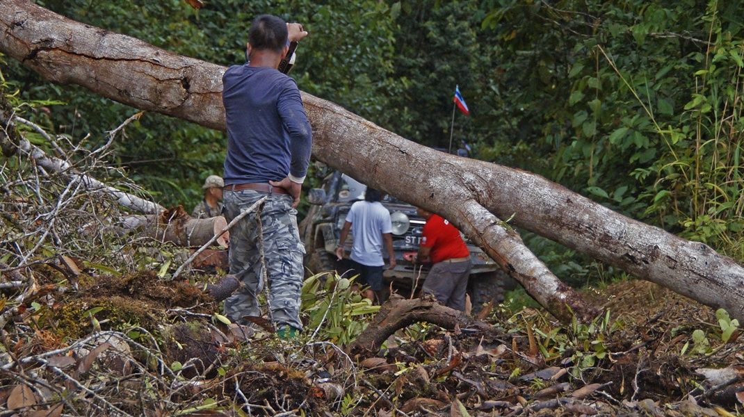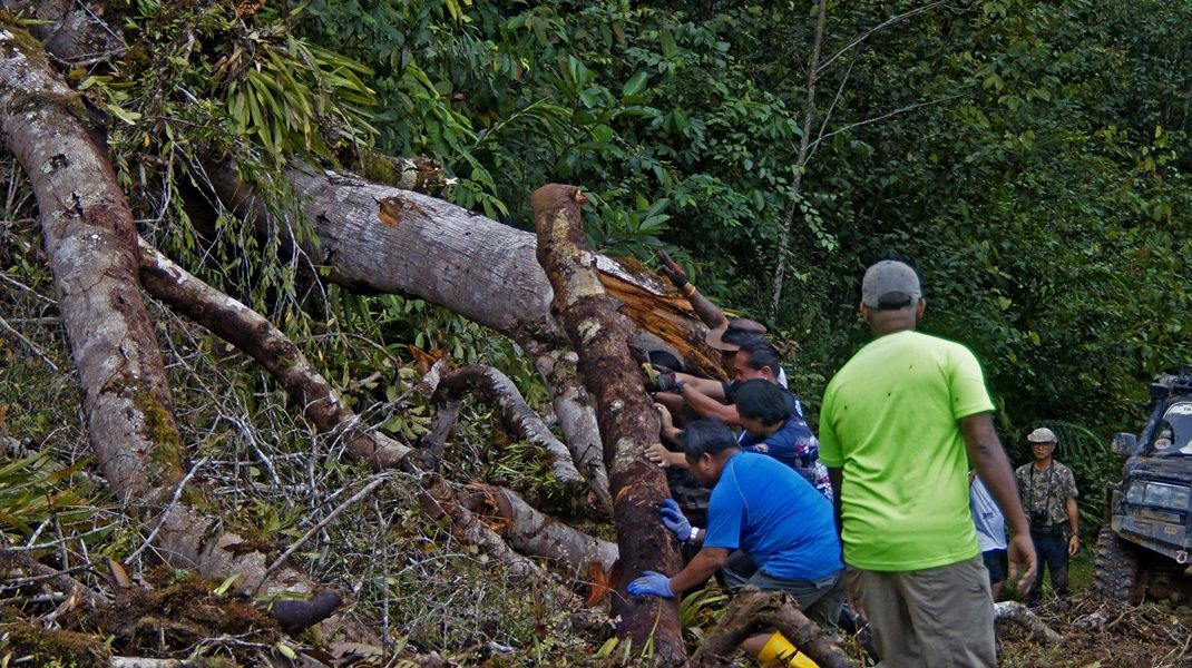 Day 6, December 2nd, The weather was very cold last night. The first group of convoy woke up early in the morning and began to climb up Mount Slukut the highest peak of Borneo in Kalimantan Indonesia at a height of 1,558 meters above sea level about halfway between Benuang Village Semamu distance 65 km. The first group of Convoy 10 cars started from the eighth kilometer moving approximately 500 meters found obstracle a large tree hundreds of years old falling block the road, using about an hour to cut and clear the tree. After that it were a long way tough, steep and dangerous mountains full of holes,channel, big and small rocks, Everyone were tiredness from walking up and down the high mountains for winching cars and had to using very long rope in many places. The steep and hard-core path seems like none stop. There were no big tree for winching , had to using ground anchor in difficult with a soft ground that pervades from rain which made the ground wet and slippery from liquid soil on the top. The toughest obstracles had more than 5-6 places. Man and machine had to fighting with hardcore heart and reach the summit of mountain Slukut at almost midnight and try to continue moving forward down from the peak of mountain but the way down from the mountain were still very dangerous in the darkness, therefore convoy group one had to stay overnight near the summit of Mount Slukut among the strong cold wind blowing and surrounding with the white mist.