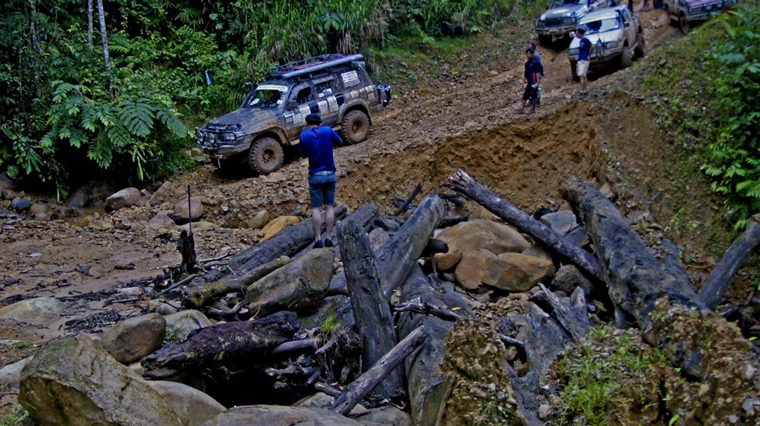 Day 7, December 3rd, the first group of 10 cars started to travel up the steep slope just under a hundred meters found the long hardcore obstracles with a line of stone like bridges full of many rutted waiting and the side were a deep abyss. And turning up to a rocky hill with many danger trenches to destroying the car's suspension along the hill road. The last hundred meters were a road that creates a large long rutting which tough and brutally, on this obstracle had to using winch by ground anchor and a large tree stump helps to winching. All 10 cars of first group spent 7 hours for passing the last hardcore obstracles. But while traveling down hill to the village of Semamu an accident occurred when a car overturned on a steep curving turn, lucky no one were hurt and arrived at Semamu village on 10 p.m.