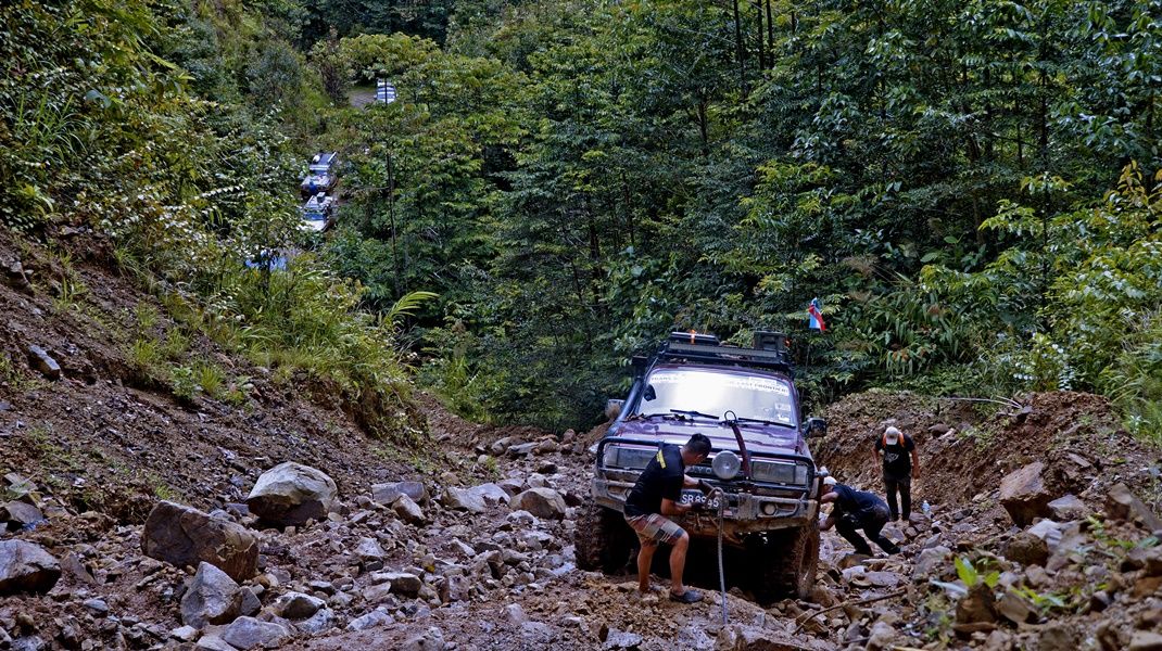At around 4 pm The final passion off-road adventure journey for challenging and fun approximately 3-5km began at the border monument and had funny time with many obtracles short off-road routes and the last point was a broken bridge couldn't skip so all offroaders had to put the wood on the stream as a bridge for all cars to run up which was full of excitement adventure in the rain and rush away from the strong water flows down and high up levels rapidly into the turbulent flow.